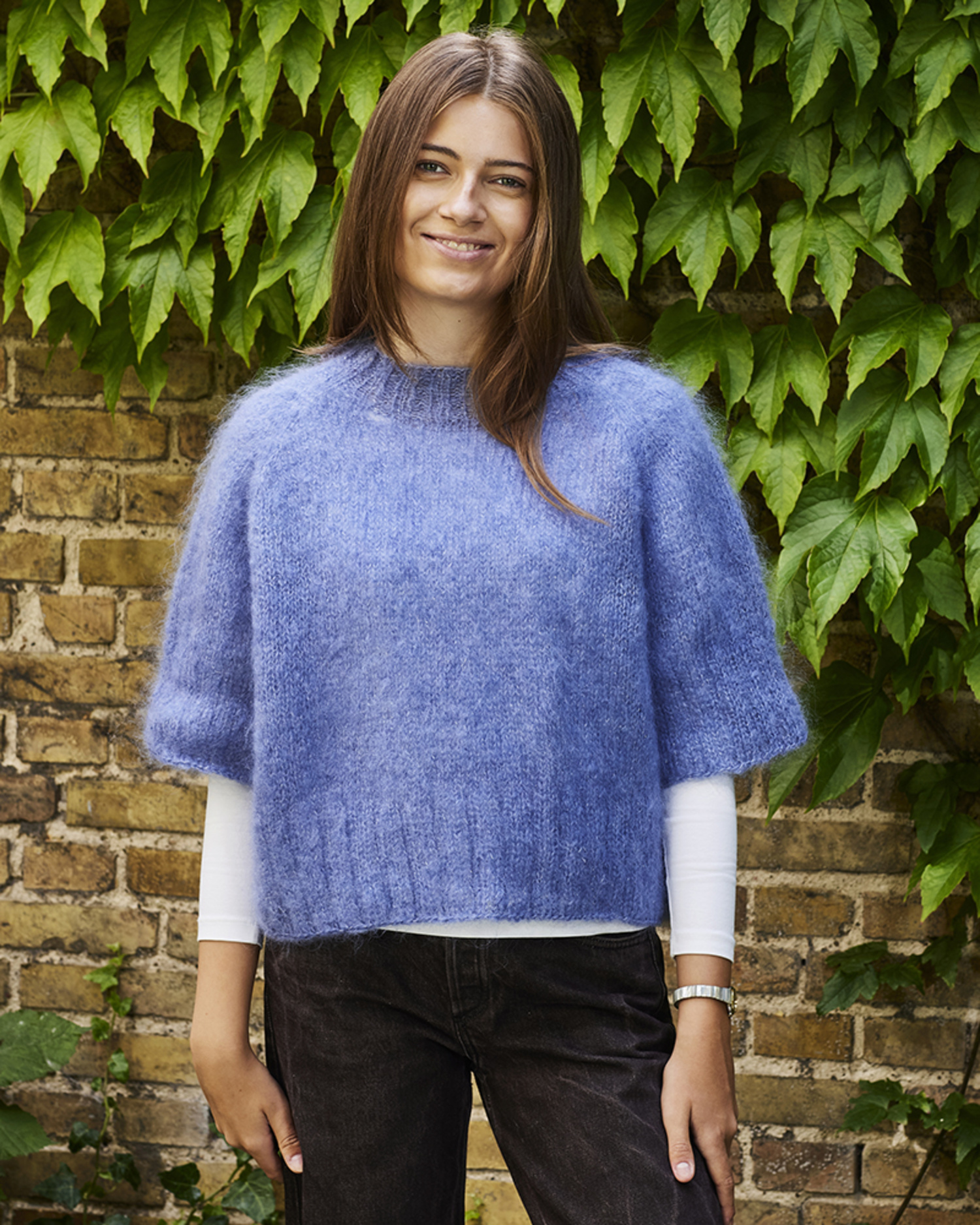 Beskrivelse: T-shirten strikkes ovenfra og ned i ett stykke med vende-m for hevet nakke. Øk ved raglanmaskene