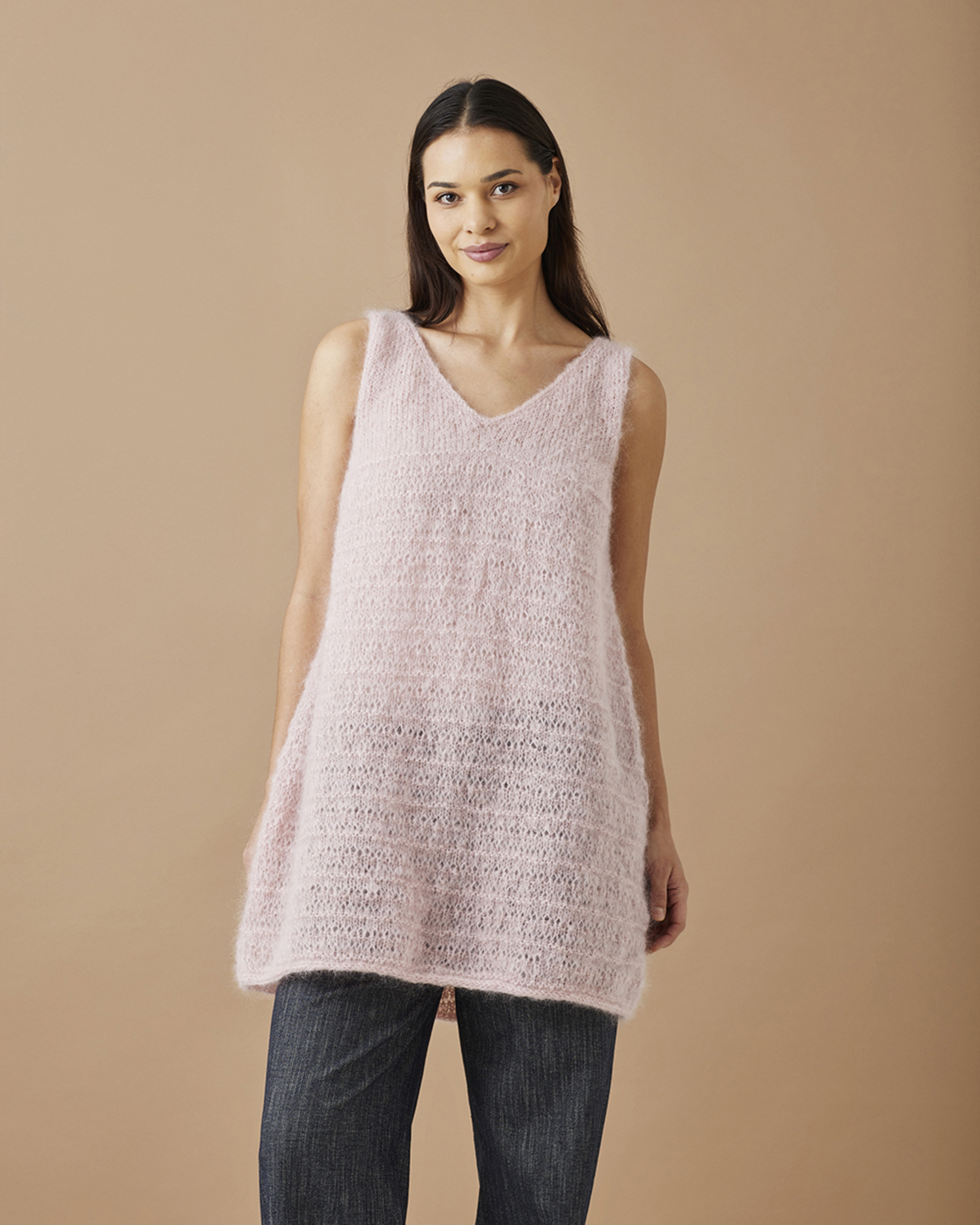 Beskrivelse: Strikkes ovenfra og ned med I-cord-kanter, fram og tilbake i glattstrikk. Etter ermehullet samles delene og det strikkes videre rundt i mønster.